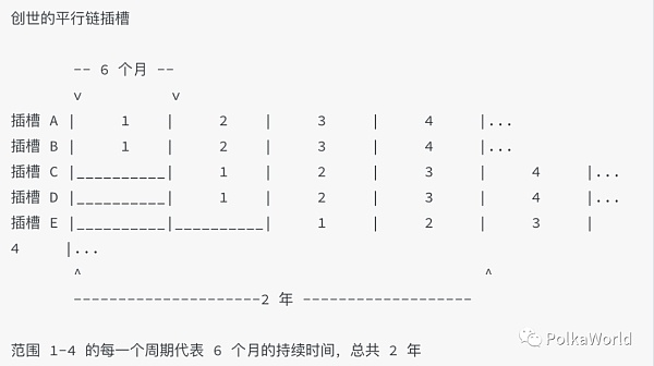 每个平行链插槽最长持续时间为 2 年。每 6 个月的时间间隔被划分为自己的租赁期。多个连续周期(period )就是一个范围(range )。