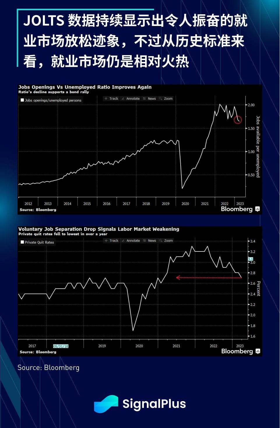 此外,良好的经济数据进一步推动债券市场上涨,欧元区核心通胀在10个月内首次出现下降,欧洲央行的银行贷款调查显示信贷条件大幅收紧,预计美联储的高级信贷人员调查也会出现同样的结果。JOLTS数据也持续走软,整体职位空缺数959万未达预期,且低于2022年的低点;职位空缺数与失业人数的比率也下滑至1.64?,显示就业市场紧绷状况有所缓解,但仍远高于疫情前的平均水平1.2?;此外,随著大规模裁员成为新闻焦点,?3月份JOLTS离职率降至2.5%?,是2021年初以来的最低水平,随著裁员消息继续缓慢地在美国经济中传播,离职率下降的趋势可能会持续。