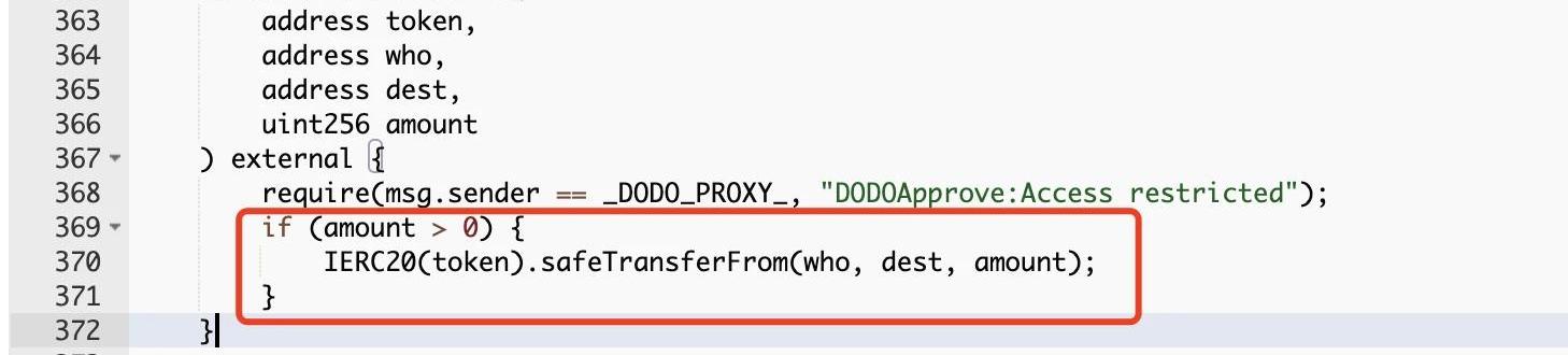 1719-1721?行在对传入的参数做校验,然后?1724?行校验fromToken是否为ETH,不是的话则会将调用者的代币转移到合约中,然后进行授权,在分析了DODOAPPROVE?合约的代码后发现只需要将fromTokenAmount设置为?0?即可绕过: