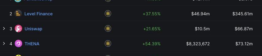 还有其他项目也在争夺BNBChain?上的市场份额,去中心化永续合约交易所Levels的交易量本周上涨了37.6%?,在该链上的所有交易所中排名第二,另一个去中心化交易所Thena本周的交易量增长了54.4%?,在BNBChain?中排名第四。?