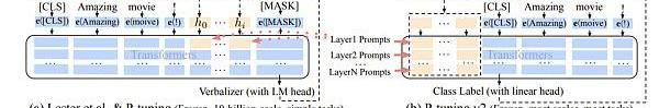 V2的改进是将原本仅在最初层输入的连续prompt向量,改为在模型传递时每一个神经网络层前均输入连续prompt向量,如下图所示。
