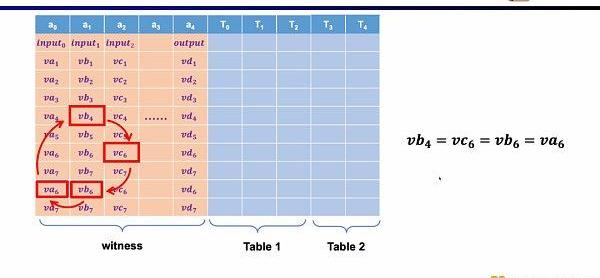 第二种约束是Permuation,即等价性校验(equalitychecks)。可以用来检查不同单元格的等价性,常用于关联电路中的不同门,比如证明上一个门的输出等于下一个门的输入。