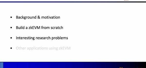 演讲分成四个部分,第一部分张烨介绍了开发背景以及我们为什么首先需要zkEVM以及为什么它在最近两年间变得如此受欢迎,第二部分通过一个完整的流程,讲解如何从头开始构建zkEVM包括算术化和证明系统,第三部分通过一些有趣的研究问题来谈论了Scroll在构建zkEVM时遇到的问题,最后介绍了一些其他使用zkEVM的应用。