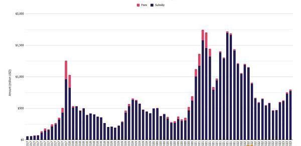 3、比特币矿工收入在四月份持续增长至7.971亿美元,但涨幅不大,仅为5.5%,同时以太坊质押收入也增长了10.6%,达到2.399亿美元。以太坊Shanghai-Capella主网升级已在4月12日完成,质押的ETH也可以被提取。