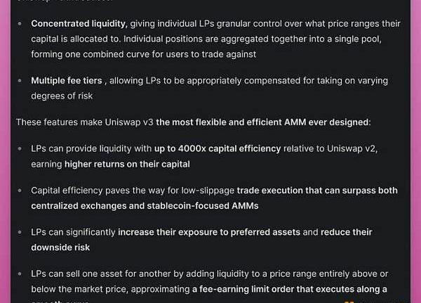 然后是两年前推出的UniswapV3,但是Uniswap此前有一个禁止分叉的许可证,有效期至2023年4月1日。Uniswap为其V3带来了几项改进,分别是:
