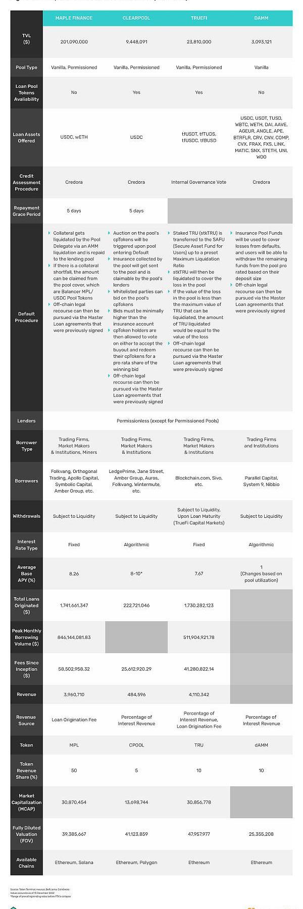 目前,截至2022年12月5日,DeFi借贷协议的累计TVL为US$13.96B,过去一年的每月借贷量从US$9.37B到US$32.46B不等。尽管这一数字即使在最近的市场收缩期间也一直保持稳定,但与TradFi市场相比,这个货币市场的规模仍然相形见绌。