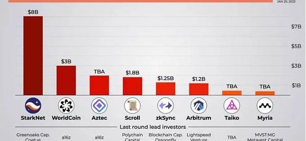Source:L2BeatRollupTVL数据乐观的数据和期待背后,展现出ZK赛道在秘而不宣地有力发展。一些头部项目已获得了资本的密切关注,投资热情高涨。项目Starkware和ZKSync分别被推到了80亿美元和约10亿美元的估值。隐私公链项目Aleo更是获得了ZKP赛道的最大融资。
