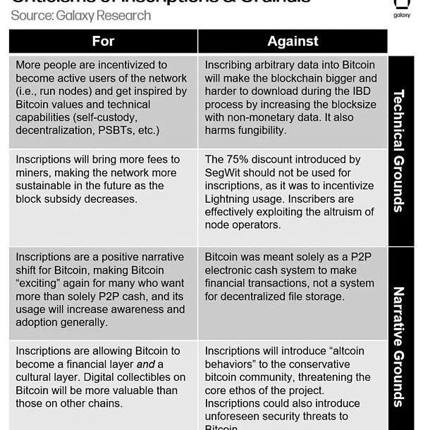 这一区块链新用途在比特币社区引发了重要的关切。自2023年1月中旬起,铭文量加速增长后,更广泛的比特币社区就其对比特币的影响展开了激烈的辩论。有关铭文的争议凸显了生态在比特币区块链的适当使用方面的技术和叙事层面上的分歧。以下简表可视化呈现支持和反对方在铭文和序数方面的观点。