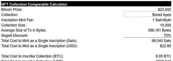 假设费率为1聪/字节,则假设比特币价格为23,000美元,完全铭刻10,000个收藏品的成本约为9.95BTC,即228,943美元。