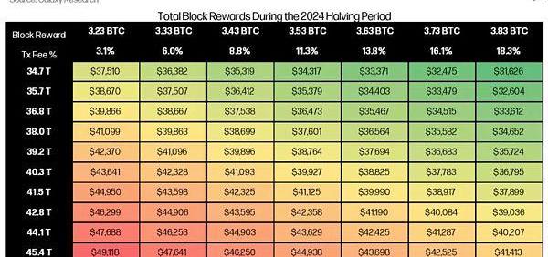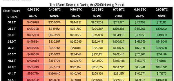 仅供说明目的,下面是另一个敏感性表格,使用2040年减半周期的区块补贴。请注意,为了维持当前和短期难度预测,手续费占总区块奖励的比例要高得多,导致图表颜色呈现更垂直的变化。
