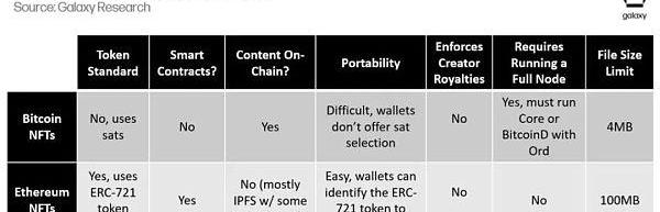 与以太坊NFT相比,比特币NFT具有不同的技术堆栈。两种数字藏品之间的主要区别例举如下: