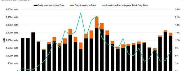 随着铭刻活动的增加和区块空间的填充,每个虚拟字节支付的平均聪将随之增加,以及支付的总交易费用。我们已经观察到铭刻活动对每日总费用产生了有意义的影响,如下所示。铭刻费用已经高达总每日费用的23%。