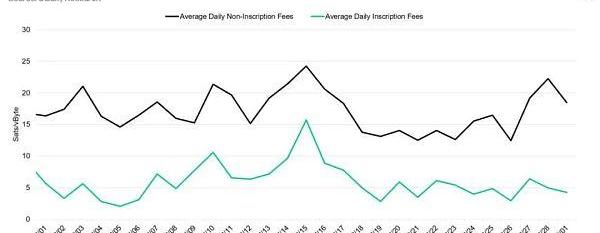 比较有铭文和没有铭文的平均聪/字节,显示过去两周都呈上升趋势。
