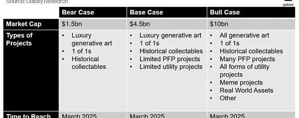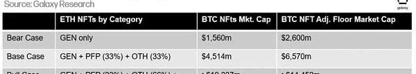 请注意,这些是基于以太坊NFT市场当前规模进行保守估计,不包括其他链上的NFT价值。此外,熊市、基准和牛市预测不包括元宇宙物品的市值,因为分析表明游戏/元宇宙资产不适合在比特币上。