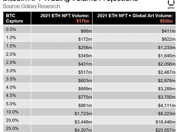 对于比特币NFT来说,要占据以太坊NFT加全球艺术交易总量的1%-2%的市场份额,生态只需要产生8.22亿美元至16.5亿美元的交易量。比特币NFT需要捕捉低个位数市场份额所需的交易量表明,比特币NFT实现8位数的交易量并不是一个不切实际的概念。