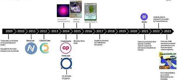 比特币上的通证化早在以太坊上NFT的创造之前就已经出现了。比特币介入NFT文化始于2012年的开源项目ColoredCoins。该项目引入了一种新的方法,将现实世界的资产或服务附加到UTXO集合上。染色币是第一个使用名为EPOBC(https://en.bitcoin.it/wiki/Colored_Coins#The_EPOBC_protocol)的机制的比特币项目,该机制通过将标签值分配到交易的第一个输入的nSequence字段中,便于转移染色币并将其与普通比特币区分开来。nSequence始终存在,但在其他方面未被全节点使用,并可以进行修剪。染色币所使用的方法将任意数据输入比特币交易中的开销为零。尽管染色币是第一个尝试在比特币上创建另类数字资产的项目,但该项目过于前沿,最终失去了比特币社区的关注。短命的染色币项目是试图在比特币上创建数字藏品的后续倡议的先驱。