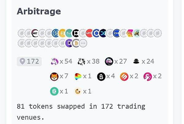 以此类推,在实际的套利交易中,搜索者还可以从多个资金池中利用多个代币对的价差实现低买高卖的套利。目前,通过智能合约,MEV机器人甚至可以瞬时间内,从上百个资金池中完成上百个代币对的兑换。例如,下面这个套利交易中,MEV机器人就在172个资金池中完成了代币对兑换,共涉及81种代币。