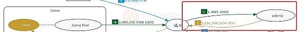 在恐慌挤兑潮和一片市场混乱中,代币价格出现剧烈波动,MEV搜索者反而能够看到获利机会。而成为MEV目标的受害者,则可能不幸承受巨额损失。在本轮USDC挤兑潮中,就出现了一例这样的MEV套利事件。一位地址开头为0x8ff的投资者试图转换其稳定币仓位,想要将其持有的203万个3CRV代币换成USDT,但其并未直接通过Curve解除LPtoken,而是经由KyberSwap聚合路由将交易发送给了Uniswap上的一个几乎完全没有流动性的LP,这个资金池在过去的251天里一直处于闲置状态。