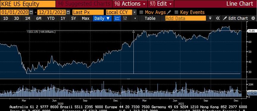 小银行的事情进展顺利。他们的NIM正在增加,因为他们为客户的存款支付0%的利息,同时将这些存款以1%到2%(UST)的利率贷给美国政府,以3%到4%的利率贷给美国购房者(MBS)。这看起来可能不多,但对于数千亿美元的贷款来说,这是一笔有意义的收入。由于这些「出色」的收益,银行股正在飙升。