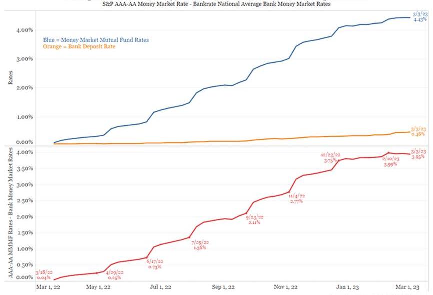 小银行无法提高存款利率,因为它们负担不起。这些银行持有的UST和MBS债券的利率低于当前的联邦基金利率。这意味着,如果它们上调贷款利率以赶上美联储的水平,他们将拥有巨大的负净息差。相反,他们只是希望储户不会注意到,他们可以把钱从银行取出来,投资于货币市场基金,从而获得几乎零风险的5%。显然,这个策略没有奏效。
