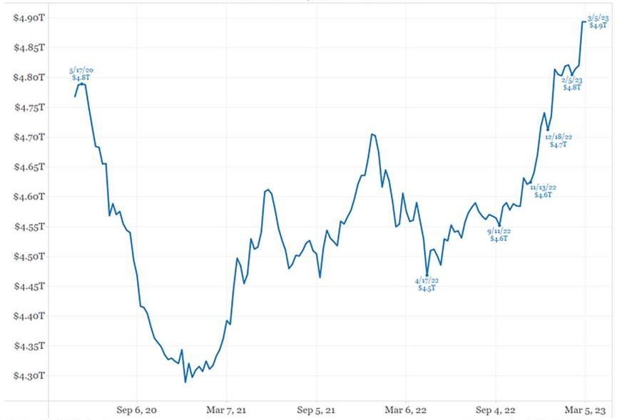 有了新扩大的BTFP,财政部可以很容易地为越来越大的美国政府赤字提供资金,因为银行总是会买任何可以出售的东西。银行并不关心价格是多少,因为他们知道美联储是他们的后盾。一个对价格敏感、关心实际回报的投资者,会对购买更多、更多、更多、数万亿美元的美国政府发行的债券嗤之以鼻。国会预算办公室估计,2023年的财政赤字将达到1.4万亿美元。美国还在多条战线上作战:对抗气候变化的战争,对抗俄罗斯/中国的战争,以及对抗通货膨胀的战争。战争会导致通货膨胀,因此预计赤字只会进一步上升。但这不是问题,因为银行会购买所有外国人(尤其是中国和日本)拒绝购买的债券。