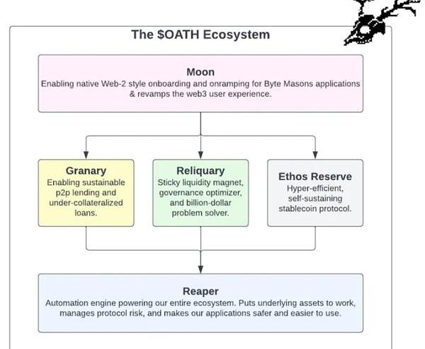 OATH是由DeFi明星开发团队?ByteMasons构建的一套产品生态系统,包括货币市场、金库、稳定币、借贷等。所有元素都为质押者和协议用户产生回报,同时产生更多对协议和$OATH的需求。