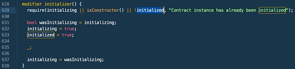 3. 上图两个initialize函数都是由initializer的修饰符修饰。根据其中代码,如果调用了其中一个initialize函数,另外一个initialize函数就无法被调用。initializer修饰符代码如下图所示,这造成了Based官方失去了初始化函数的机会: