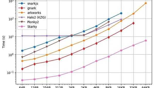 在所有SNARK框架中,rapidsnark是内存效率最高的。我们还看到,由于查找表的固定设置成本,当原像尺寸较小时,Halo2使用更多内存,但当原像尺寸较大时,整体消耗的内存较少。