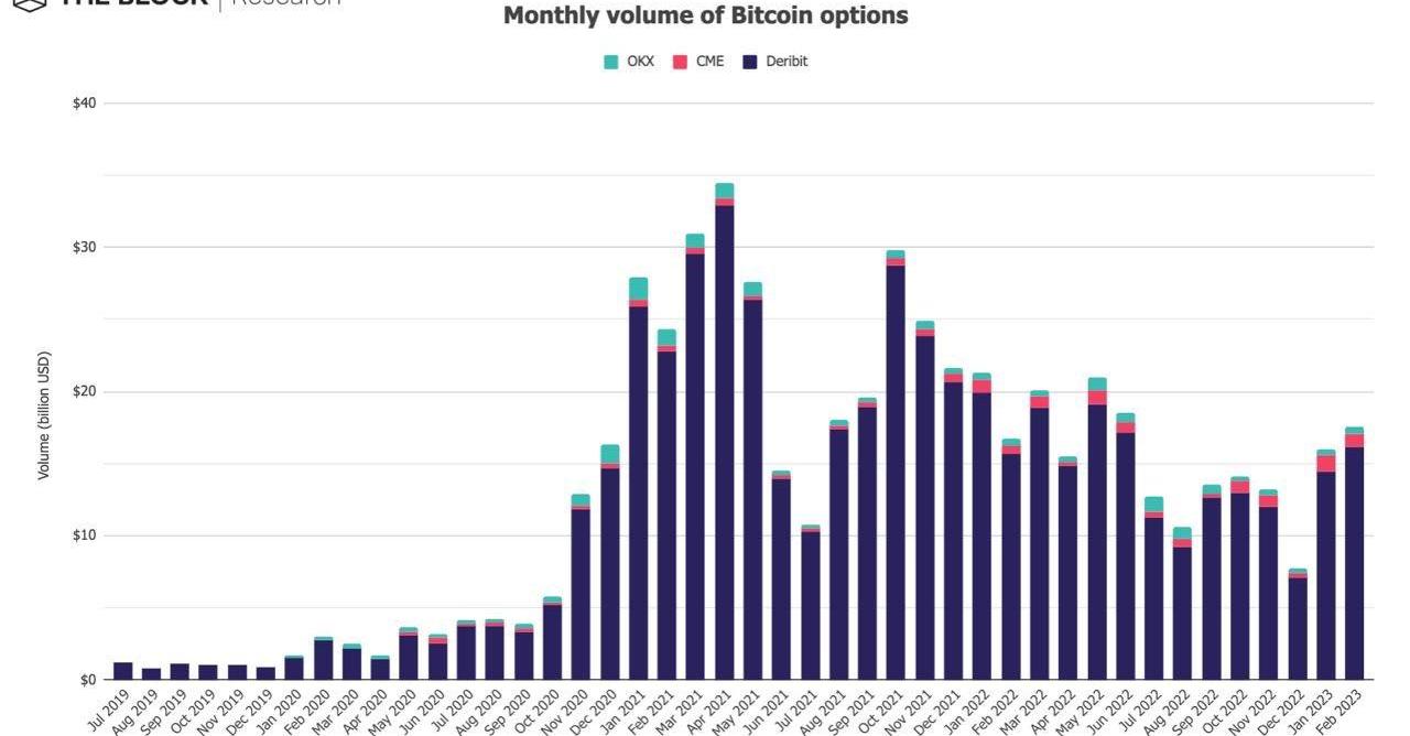 12、在加密货币期权方面,比特币和以太坊期权持仓量也都出现上涨,但涨幅较一月有所减少,其中比特币期权持仓量涨幅为3.3%,以太坊期权持仓量涨幅为18%。比特币和以太坊期权交易额同样普涨,其中比特币期权交易额在二月份增长了10%,达到176亿美元;以太坊期权交易额涨幅为22.4%,达到104亿美元。