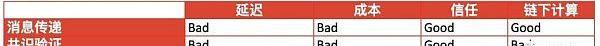消息传递的延迟相当高,因为消息传递需要时间来确认。在区块产生后,用户才能确认传递成功。在成本方面,消息传递需要与两个链进行交互,因此比较高。这种方式需要的信任较少,因为安全性等同于链的安全性。这种方式没有进行任何的链下计算。