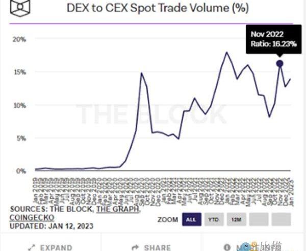但是我们可以从数据中看到,在FTX雷暴之后的几天里,DEX的交易量迅速翻倍,大家对中心化机构的恐惧变成了对去中心化金融协议的信任,因此,这个行业不是没有规则,而是在Crypto世界里,只有代码才是规则,代码才是法律。我们不必相信任何中心化的组织,相反,我们可以相信开源协议和智能合约的安全性。**这是DeFi对下一轮的叙述之一:取代现有的中心化金融机构。**2020年,由于贸易挖矿、产量养殖和其他激励措施,DEX交易量一度占到CEX交易量的15%.然而,经过两轮的下降,已经没有足够丰富的采矿代币激励措施。然而,我们看到,最近DEX交易量已经回升到15%,这与新兴技术的发展曲线是一致的。也就是说,在泡沫消退后,越来越多的人开始将DEX作为日常交易的场所,取代了CEX的功能。