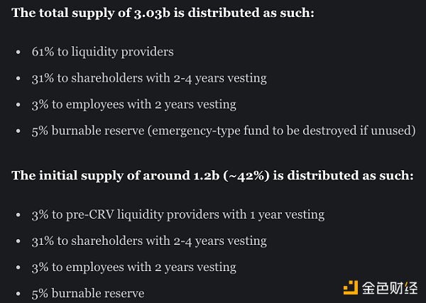 Curve代币今天开始发行,总发行量30.3亿枚(61%分配给流动性提供者,31%给股东,3%给员工),初始发行13亿枚,每天发行200万枚代币。将代币分发给过去和当前的流动性提供者,投资者,员工和Curve DAO储备金库。