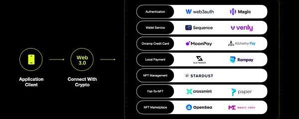 一个应用想要完整的接入Web3,不光是自建应用市场的构建,还涉及到账户认证、钱包服务、出入金、和相关NFT配套管理等多个环节,而其中的每一个环节都有不同的供应商来提供技术服务,他们也有着不同的技术口径、标准和对接的节奏。