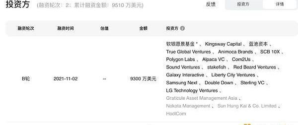 融资:累计融资2次,融资总金额为9510万美元,主要投资方软银愿景基金、AnimocaBrands、蓝池资本、PolygonLabs、LibertyCityVentures、SamsungNext等。