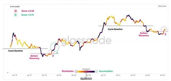 与以往的熊市相比,类似的底部发现阶段反弹都引发了一定程度的抛售,抛售者主要是在低点附近积累的实体。最近的反弹也不例外(红色D点),积累趋势指标已降至0.25以下。