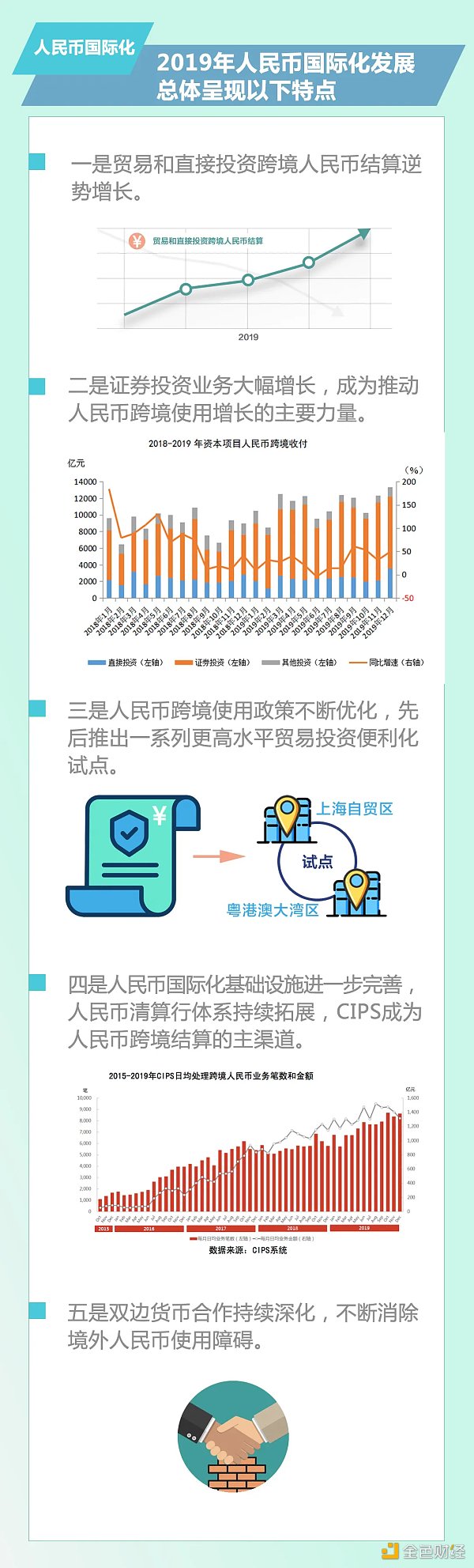 2019年,人民币国际化发展总体呈现以下特点:一是贸易和直接投资跨境人民币结算逆势增长;二是证券投资业务大幅增长,成为推动人民币跨境使用增长的主要力量;三是人民币跨境使用政策不断优化,先后推出一系列更高水平贸易投资便利化试点;四是人民币国际化基础设施进一步完善,人民币清算行体系持续拓展,CIPS 成为人民币跨境结算的主渠道;五是双边货币合作持续深化,不断消除境外人民币使用障碍。
