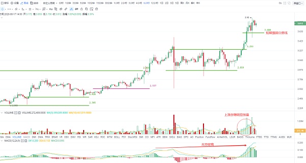 如图所示,在这轮拉升后价格和MACD指标间没有出现顶背离,而且成交量也有明显放大现象,说明确实有很多跟风资金介入,且从当前的回调力度来看,主动离场的资金不多。建议接下来继续看涨为主,短期重点关注3.6一线支撑,看作短期强弱分界线,明确破位减仓或离场,未破前持仓待涨为主。