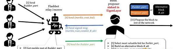 在MEV-Boost和使用中继的情况下,验证者不能将自己的交易插入到第三方构建者构建的区块中,因为在区块被提议上链之前,他们看不到区块内容。中继只向验证者显示区块头和奖励。只有在验证者签署区块头后,中继才会发送回区块的完整内容,以便验证者提议上链。这是为了确保验证者不能通过查看区块内容并重建区块来抢跑构建者。然而,如果通过EigenLayer对抢跑构建者的验证者施加额外的罚没规则,就可以更大程度保证构建者的区块部分在区块起始时就被正确包含,否则,再质押的验证者将面临严重的罚没惩罚。