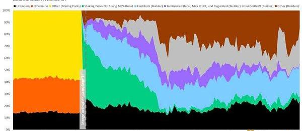 截至2022年12月,大约有80%的以太坊验证者通过MEV-Boost这一中立第三方软件获取MEV。MEV-Boost是由Flashbots与以太坊核心开发人员合作设计的,是一个允许验证者与多个链下市场连接以拍卖区块空间的软件。通过中继,验证者接收包含优先费用及由第三方区块构建者构建的MEV区块。