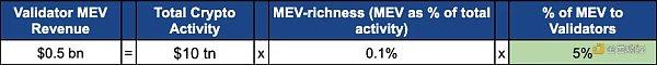 假设你可以预测未来“MEV市场”的确切规模。然而,该价值的分配方式是一个巨大的变数。假设今天区块验证者获得50%,供应链中间商获得45%,用户获得剩下的5%。对区块验证者来说真正重要的是: