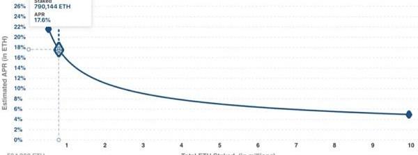 但是,当高APR吸引大量的ETH质押时,APR会慢慢下降,当ETH质押量达到1000万个时,APR将下降到5%左右,也就是目前的水平。不过,随着ETH质押量的增加,APR下降曲线也会更加平缓。