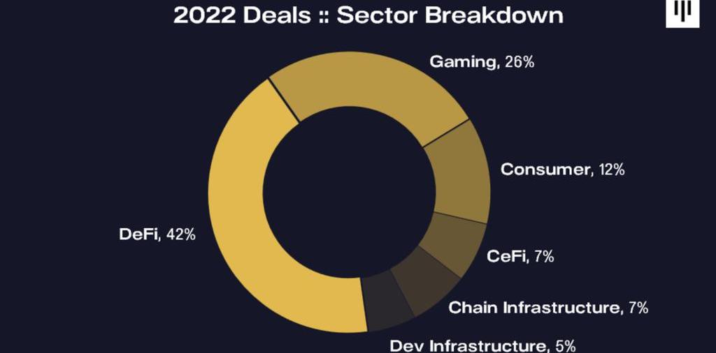 从上面的饼图来看,在Pantera2022年交易的行业细分中,DeFi处于领先地位,游戏/消费行业位居第二。DeFi投资主要集中在以下领域: