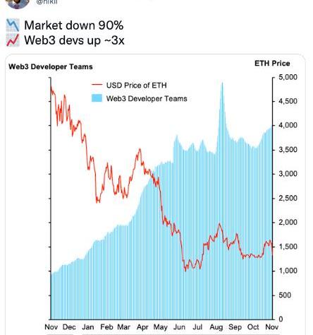 对风投来说最重要的是进入生态系统的人才的质量和数量。根据Alchemy的数据,在这个熊市期间,在其领先平台上构建的开发者数量增加了两倍: