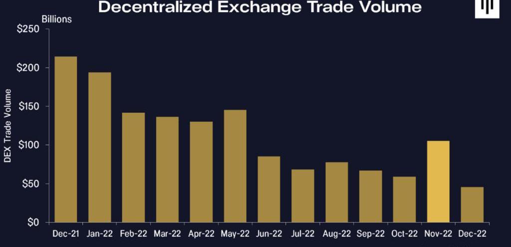 FTX之后,交易量已转移到Coinbase和Bitstamp等受到高度监管的交易所,以及基于DeFi的去中心化交易所。以下是过去12个月内的去中心化交易量,其中11月交易量显着上升。?