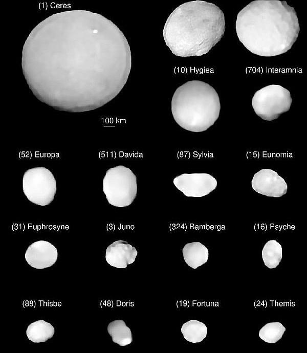 大量直径为100至210公里的小行星的图像,按比例绘制。
