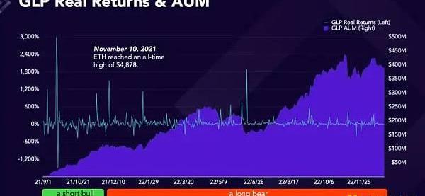 在GMX发展的第一阶段,也就是牛市中,GLP的AdjustedAPR经常为负值,但AUM却持续增长。