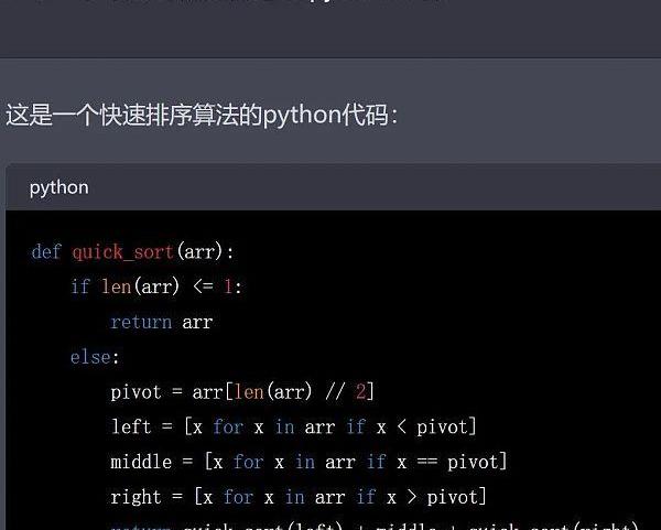 ChatGPT回答:这是一个「快速排序算法」的python代码,然后就是一串完美的代码。