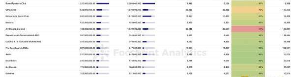 第二是庄家控制地板价。因为地板价将会影响到普通NFT持有者的情绪,那么如果NFT筹码比较集中的被庄家持有,他就能够操控批量地址挂单价格从而影响整个NFT地板在不同价位的交易深度,使得地板价价格能够迅速拉高和降低。因此对于普通投资者而言,规避持有者比例更高的NFT,也许能够降低风险。