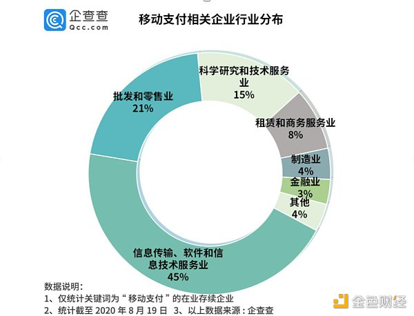 目前移动支付相关企业还是以科技型企业为主,数据显示,45%移动支付相关企业分布于信息传输、软件和信息技术服务业,15%分布于科学研究和技术服务业,其他企业多分布于批发零售业、租赁和商务服务业等行业。