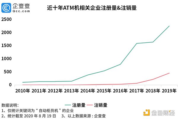另外,自2014年起,ATM机相关企业注册量呈现上升趋势,2014年至2019年注册量平均增长了46%,但相关企业的注销/吊销量同时也在上升,2014年至2019年注销/吊销量平均增长了128%,超过年注册的增速。